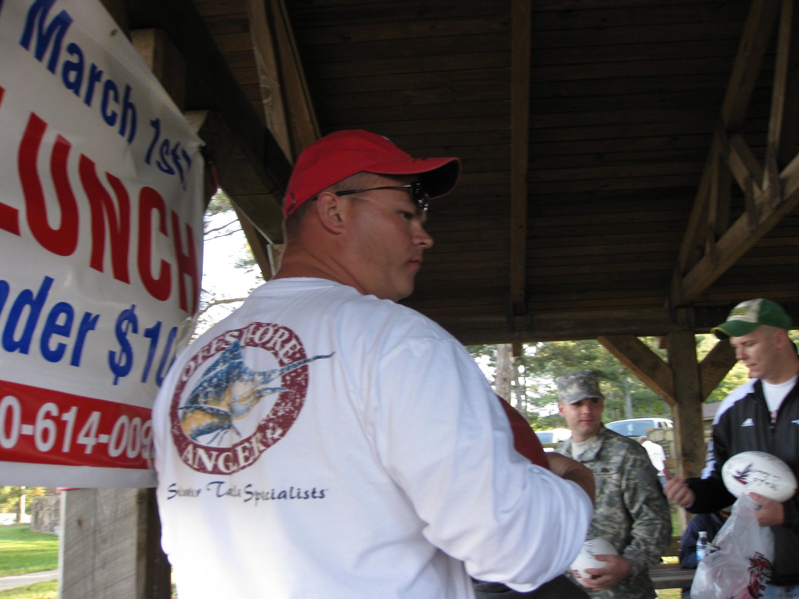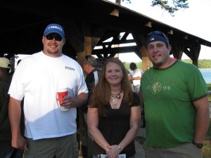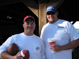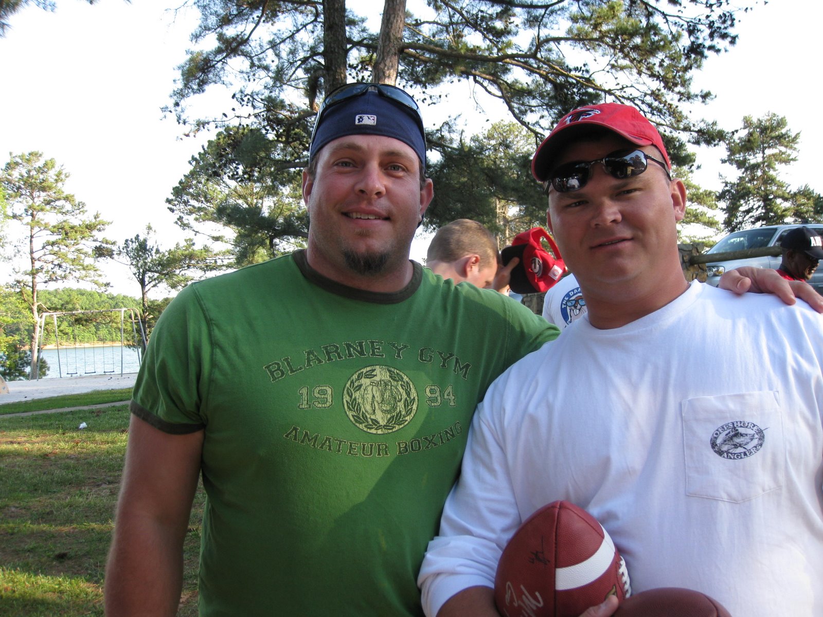 On the water, finally, we’ve got our honored Vets- One wearing the Michigan T-shirt and the other in the red UGA hat – Go DAWGS! One Falcon is in the front, this is Justin. The other player is Tyson in the middle.